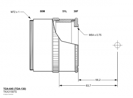 The newly designed TOA-645 field flattener provides an optimal optical solution for both TOA models, allowing them to be used at their maximum performance, without any compromise. The corrected image circle has a diameter of 60 mm. The optimal backfocus of each telescope is achieved by using an M72 extension ring specific to each model : #51L for the TOA-130, #51S for the TOA-150. The photo adapter with M54 thread, or CA Ring35, is also common.