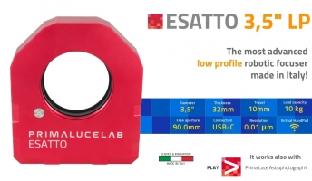 ESATTO 3,5” LP is the most advanced yet affordable low profile robotic focuser specially designed for the most demanding astrophotography! At just 32mm of thickness, ESATTO 3,5” LP provides a large 90mm free aperture with 10mm of travel, impressive 10 kg of payload capacity and an astounding resolution of 0.01 microns per step! ESATTO 3,5” LP has been designed for telescopes with little available backfocus, requiring a low profile focuser - Great for astrographs! And like all the other ESATTO focusers, it comes with a USB-C port to let control it from your EAGLE or any Windows computer, ARCO port to let you connect to ARCO rotator, temperature probe port, WiFi connection to let you wirelessly control with a smartphone or tablet and dimmable LED lights! Check out more about ESATTO (yes, it's Italian for "EXACT") below.